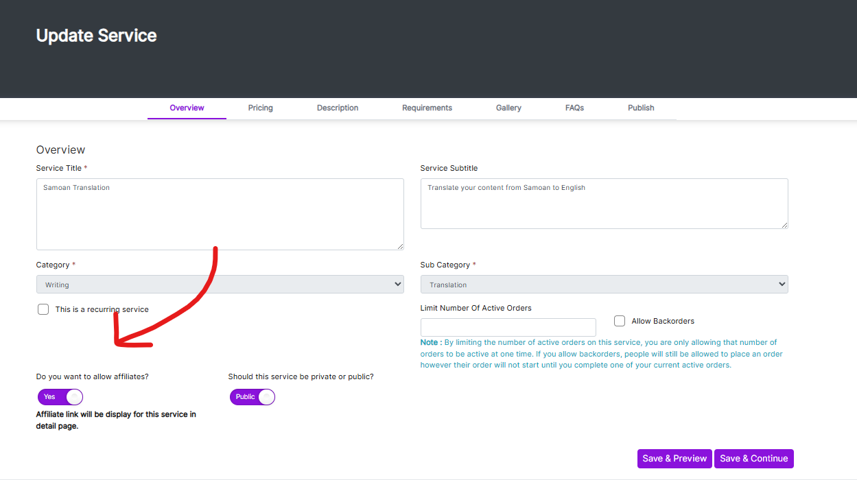 Simply turn off the toggle for either allowing affiliate for your profile page, or for your services, or both. (pictured below)