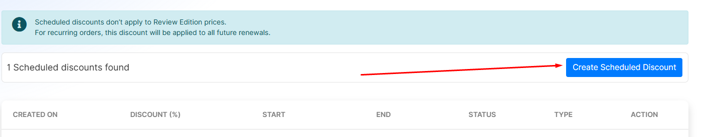 You'll be able to create a new Scheduled Discount by clicking on "Create Scheduled Discount" (pictured below):