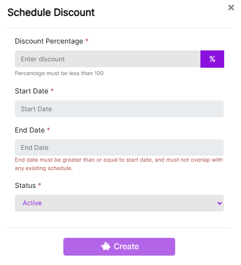 Set the discount %, as well as a start and end date, which will be reflected on your package once you click on "Create".