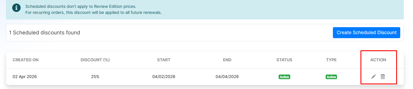 If you'd like to Edit or Delete your Scheduled Discount at a later time, you can do that too, by clicking on the appropriate icons under the "Action" section:
