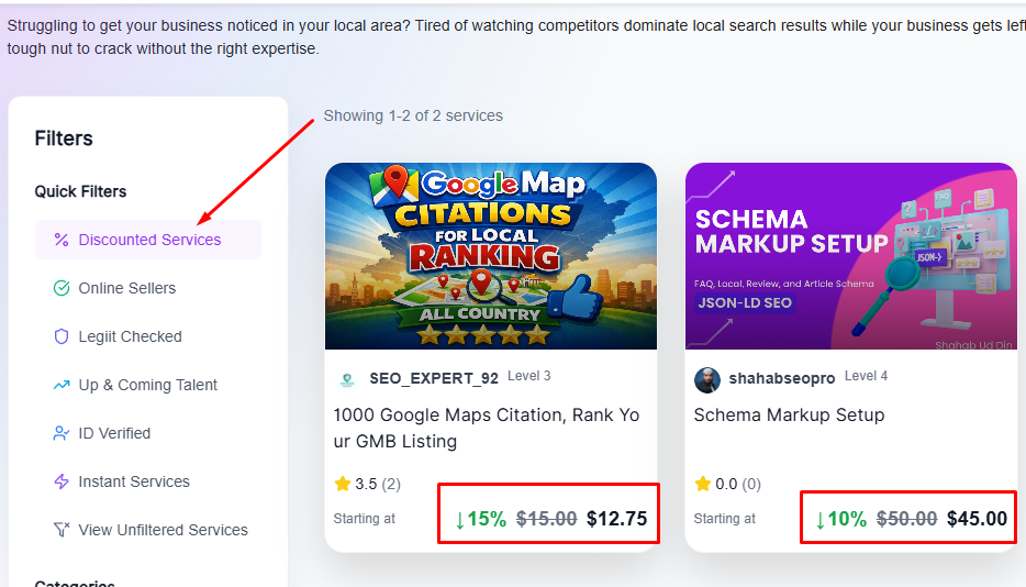 Your service will also appear under the Category Quick Filter "Discounted Services"! (pictured below)